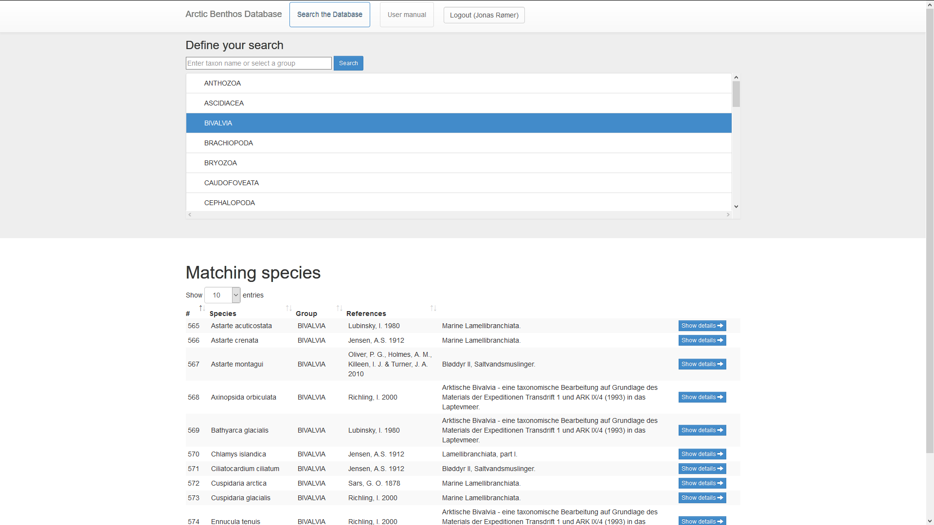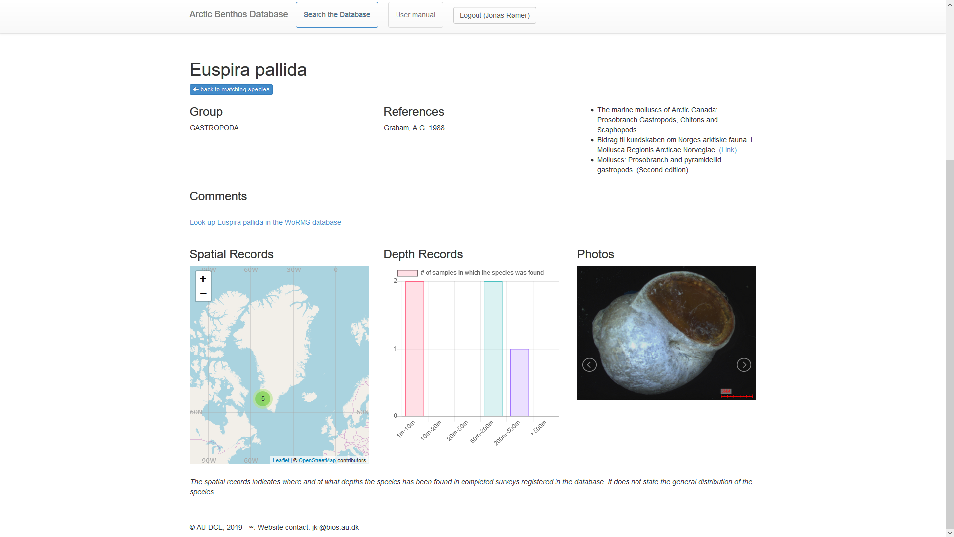 The Arctic Benthos Database is a macro-fauna identification support system for species found in the seas around Greenland, based on historic data archives from surveys carried out by AU-DCE. It has been developed with special thanks to Steffen Lundsten, academic and taxonomist, who for decades with passion analyzed and kept photos and records of the Greenlandic benthos samples.